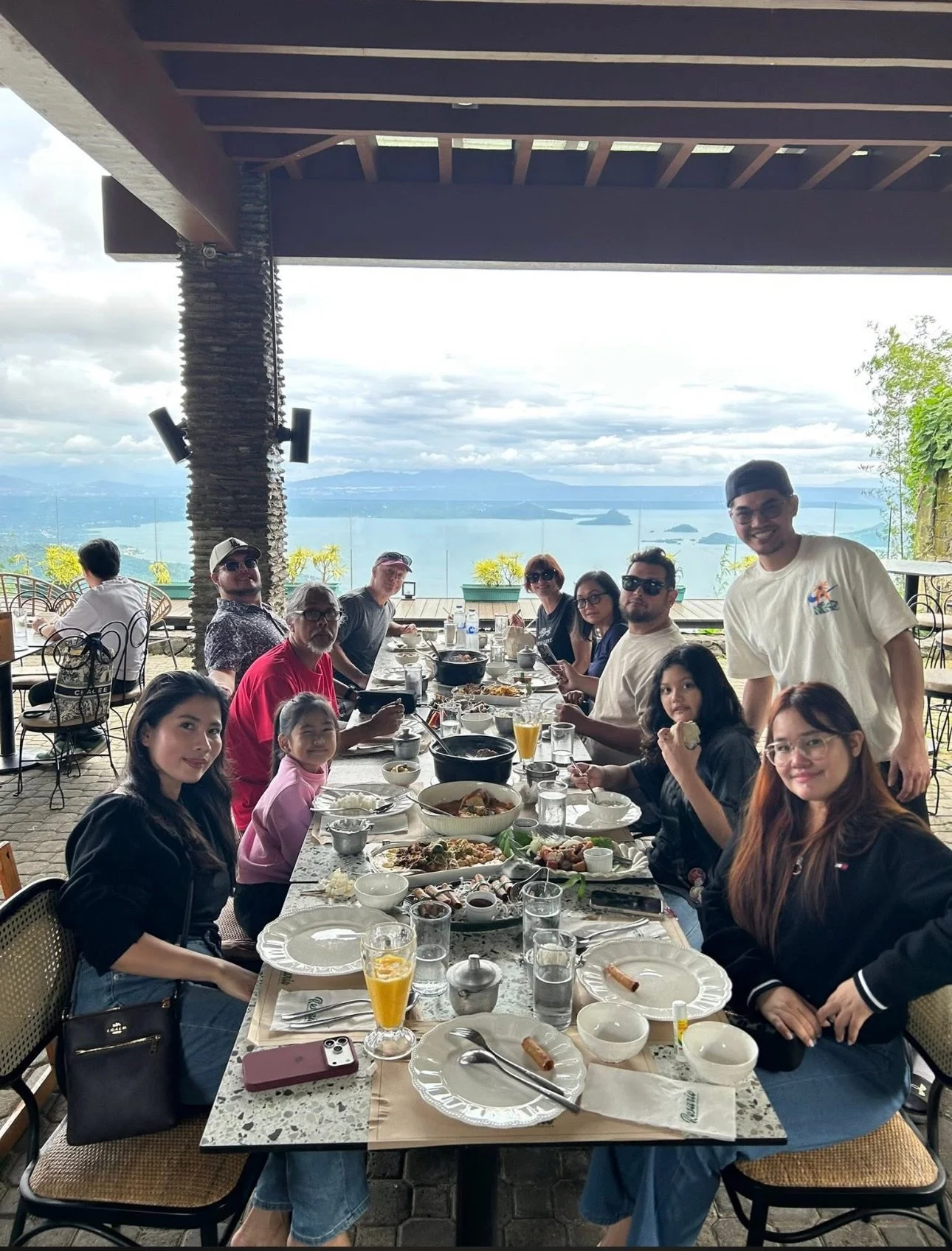 Making new friends, enjoying Filippino cuisine in full view of a volcanic ring